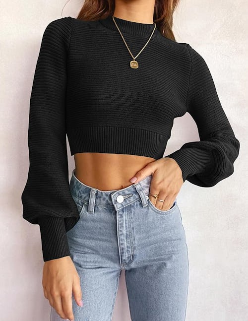 This cropped mock-neck sweater is your solution for flaunting some skin while staying cozy. The shorter cut is practically designed for high-waisted jeans or trousers; its soft ribbed knit feels like a hug, and the mock neck and lantern sleeves keep things looking polished.