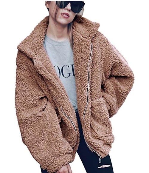 Crafted from cozy textured fleece, this teddy bear jacket is the cuddly and chic piece you’ll reach for constantly. Designed with an oversized fit, mock neckline, and zip front, it’s an obvious choice for lounge looks — but it’d look incredibly stylish worn over a slinky maxi dress.