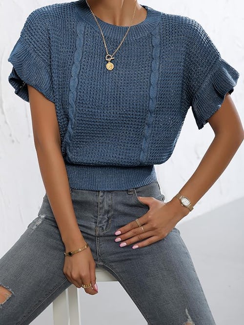 A Textured Sweater With Romantic Ruffled Short Sleeves