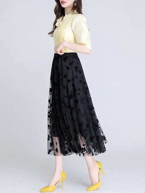 Featuring a layer of sheer, 3D-printed floral tulle over smooth lining, this A-line midi skirt looks (and feels) like something straight out of a fairytale. The high, elastic waist delivers a customized fit — but since it’s flat, it won’t detract from the chic, dressy energy.