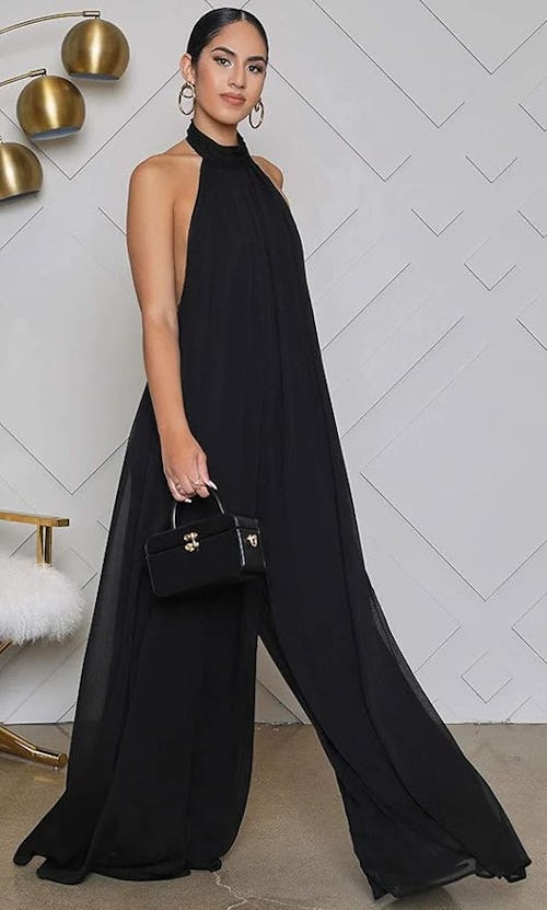 An elegant halter neckline that leads into a daring open back; floaty chiffon fabric that drapes beautifully with every step; this jumpsuit brings the drama (in the best way). The flowy fit of the palazzo pant almost feels like pajamas, but the overall look reads event-ready. Slip on a low kitten heel and you’ve got one of the most comfortable yet fuss-free formal outfits imaginable.