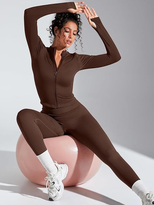 With a long-sleeve zip-up top in buttery, body-skimming fabric and high-rise leggings to match, this workout set looks polished and put-together. The seamless, super-stretchy material moves with you whether you’re working out or running errands — and highlights your curves no matter what.