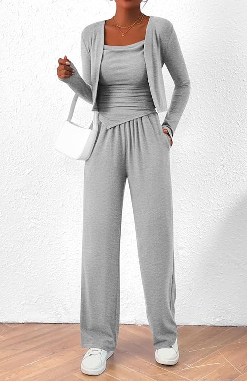 This matching set gives you three chic pieces for the price of one. The wide-leg pants feature a high, gathered waist, which looks ultra-chic paired with the camisole’s asymmetrical handkerchief hem and draped neckline. Top it off with the cropped open-front cardigan for an instantly put-together lounge look.