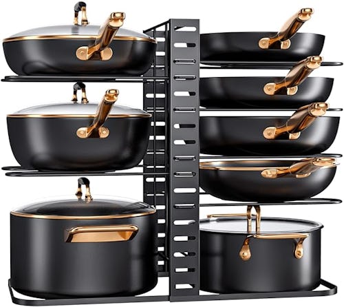 An Adjustable Rack To Neatly Store Pots, Pans & Lids