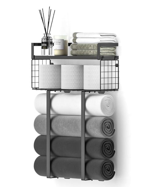 Add tons of storage space to your bathroom with this genius towel holder. It holds four standard-sized towels, three rolls of toilet paper, and various toiletries and other supplies on the top shelf. Choose from five shades in the listing.