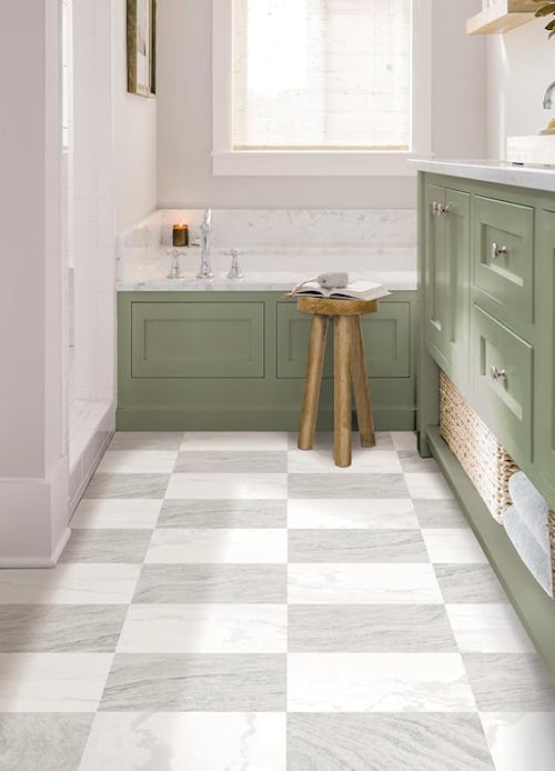 If you don’t feel like splurging for a total flooring redo, these peel-and-stick tiles are a simple way to make a big impact. Available in multiple shades, these tiles create a classic checkerboard pattern with a marbled finish that softens the look and makes the whole effect a touch more sophisticated.