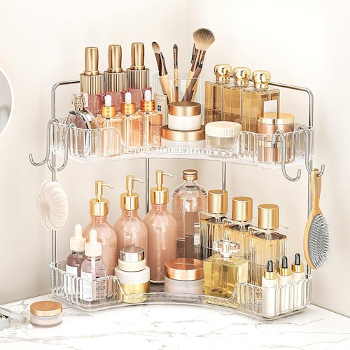 Take advantage of an awkward corner for storage thanks to this two-tier organizer. Made from ribbed clear plastic with a sturdy metal frame, this pick can easily support heavy products like cosmetics in your bathroom, spices in your kitchen, supplies in your office, and more. You can pick up versions in different colors or with three tiers in the listing as well.