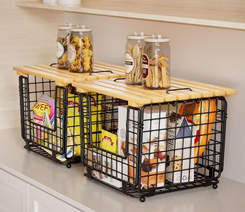 Use these metal wire baskets to store produce in the kitchen, cleaning products under the sink, cosmetics in the bathroom, or snacks and dry ingredients in the pantry. The wooden tops let you stack them or store items on top, but since they have wide openings in the front, you can access their contents without having to take them down.