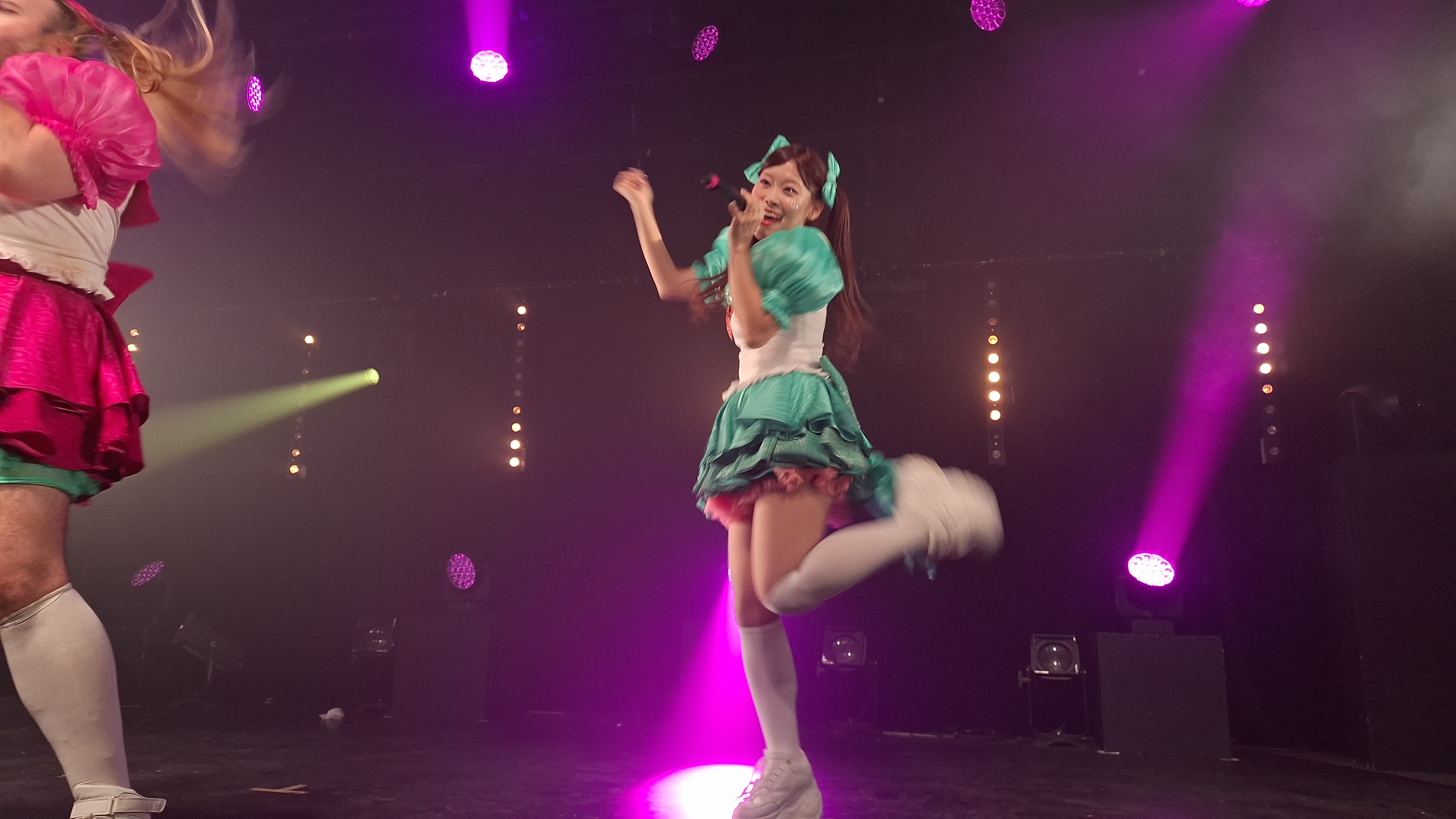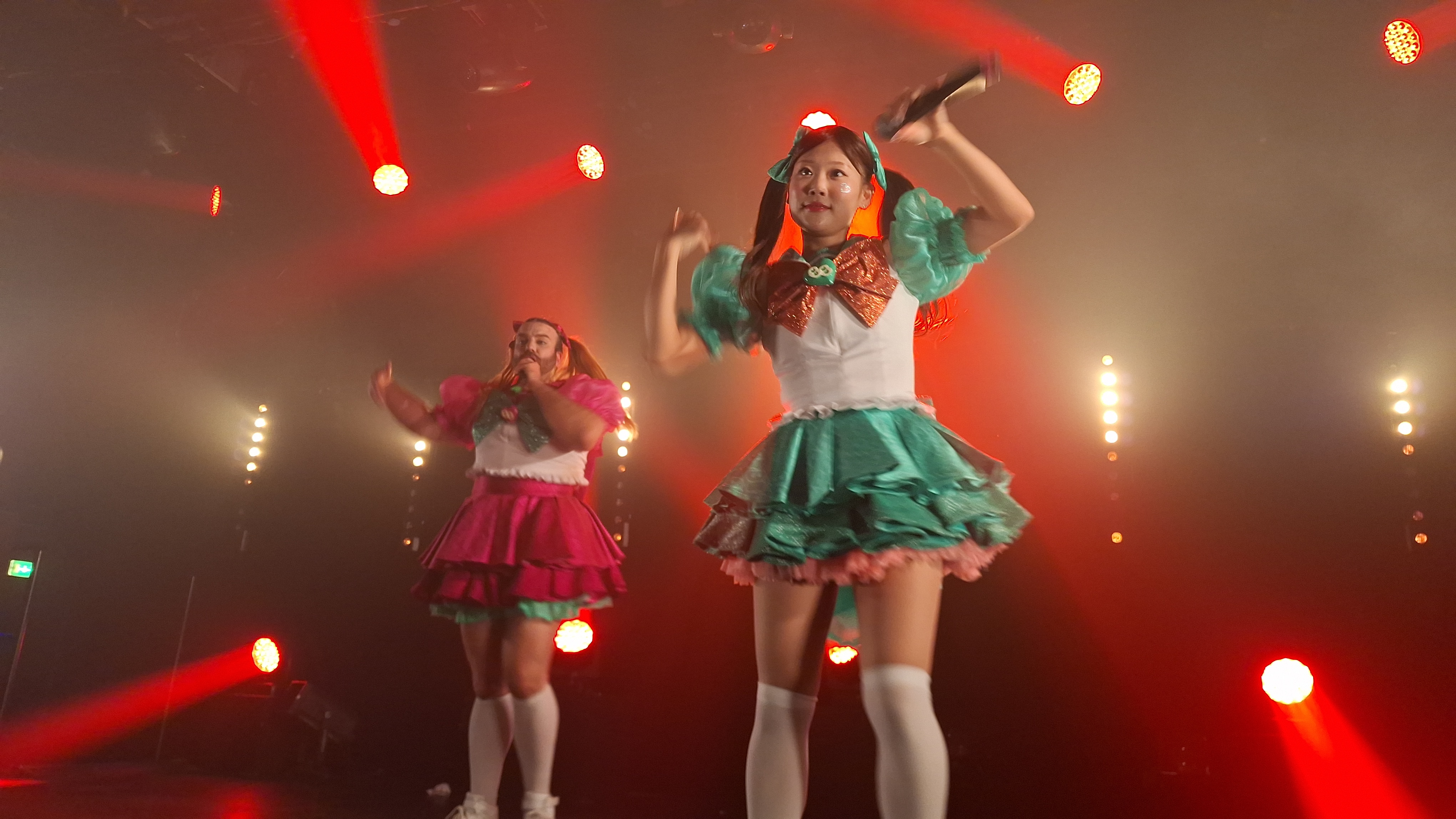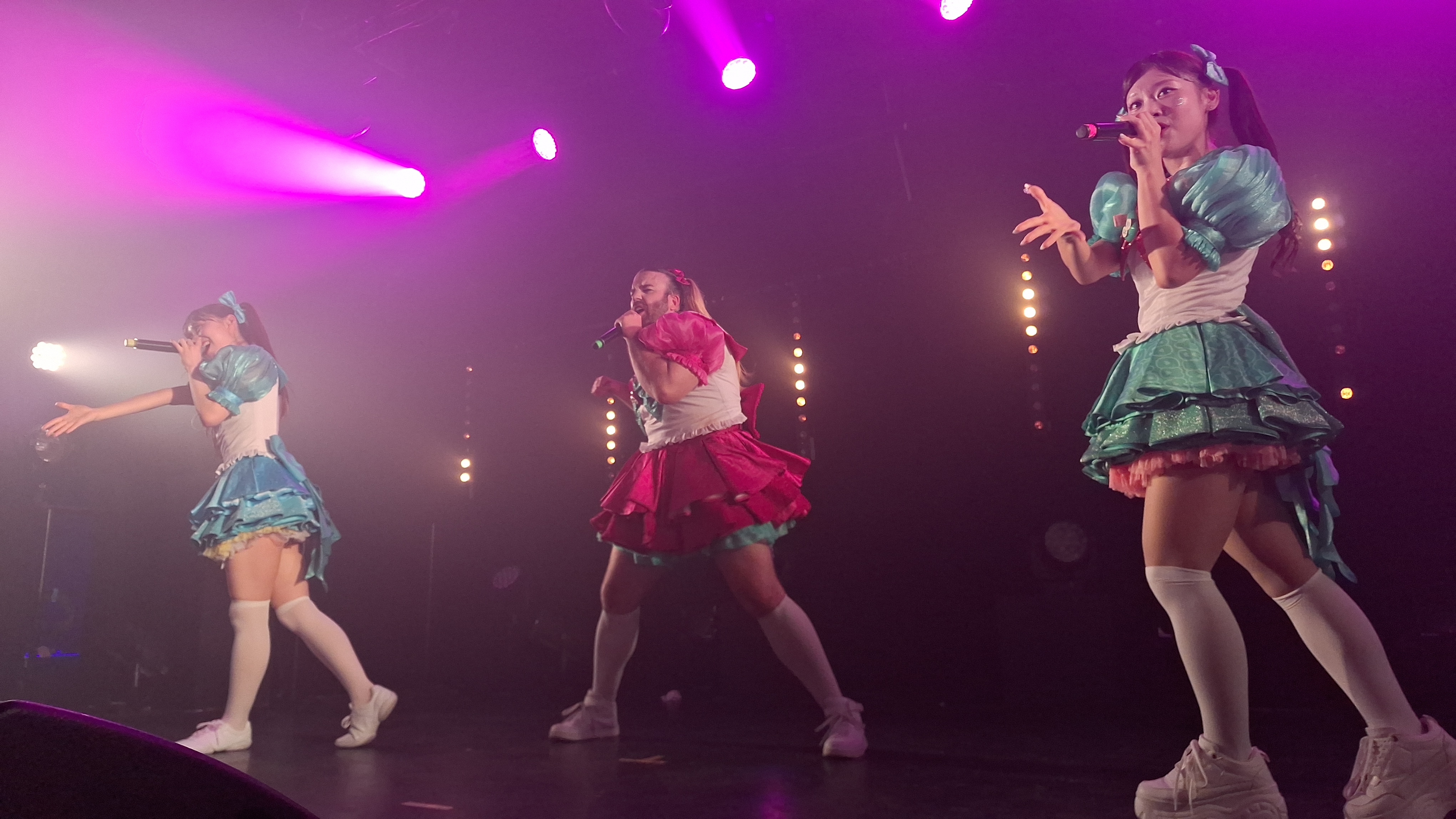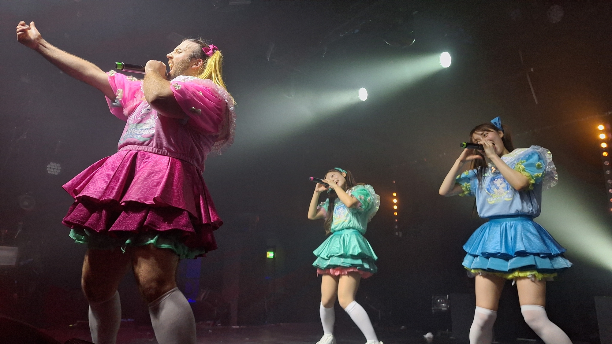 Sans première partie, c’est peu après 21hoo que Babybeard a débuté leur concert arrivant l’un(e) après l’autre sur scène sur une musique d’intro. Leur set a commencé par les deux chansons qui ont fait leur succès « Nippon Kara Konnichiwa » et « PIENNIZER » avant un premier MC de présentation des membres. SUZU habillée de vert qui est présente depuis la formation du groupe et MIZUKI habillée de bleu qui est arrivée seulement depuis juin. Sous la direction de Ladybeard vétu lui de rose, elles se présenteront en nous disant qu’elles sont leurs passions dans la vie. Ladybeard a confirmé qu’ils travaillaient actuellement sur leur premier album avant d’enchaîner les deux nouvelles chansons qui seront sur ce disque « SEMI-FINAL » et « MACHO! » qui sont visiblement déjà bien adoptées par le public.