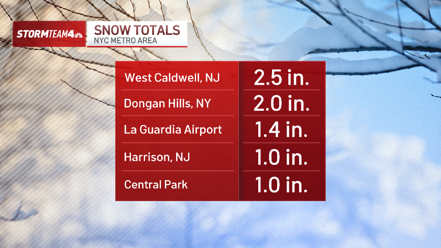 How much snow are we expected to see once things wrap up? Those in the city, out on Long Island and central New Jersey may have anywhere from 1-3 inches to contend with. While areas more north and west could see up to 5 inches, potentially.