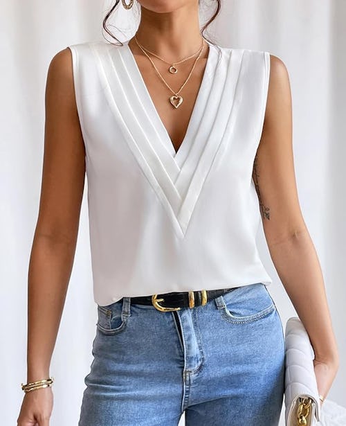 With a built-in padded shelf bra, this racerback tank top ensures you can go braless and still maintain support. You won’t have to deal with exposed bra straps — and the ribbed fabric, V-neckline, and decorative henley-style buttons ensure it’s as chic as it is practical.