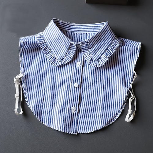For a layered look with less bulk, there’s this ruffle-trim faux collar. Made entirely from cotton, it slips on easily and stays put thanks to adjustable elastics that loop around your arms. The button detail gives it a bit of prep-school polish, perfect for layering under a crewneck sweater.