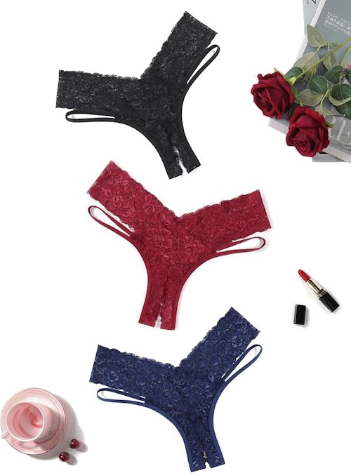 Spice up your underwear drawer with these floral lace panties. Crafted from stretchy lace, with strappy cutout sides and a low, V-cut waist and back, they’re already pure statement-making heat. A split crotch really heats things up behind closed doors.
