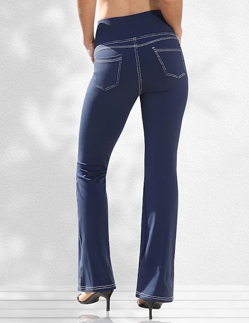 These pants offer the polished look of bootcut jeans with the all-day comfort of leggings. The contrasting stitching and slightly flared leg are serving chic, while a high elastic waist and stretchy fabric keep them comfortable and soft.