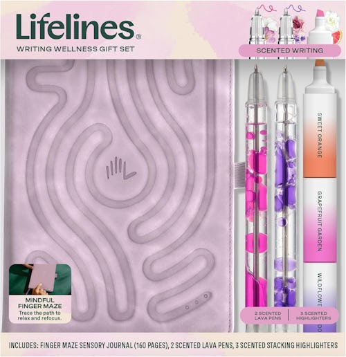 The journaling kit is designed to engage multiple senses, supporting focus, relaxation, and mindfulness while writing. It includes a 160-page journal with a tactile maze cover and embossed interior patterns that encourage grounding before writing begins. Two scented lava gel pens combine flowing visual elements with calming fragrances, while three scented, stackable highlighters add color-coded organization with aromatherapy benefits.