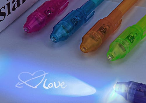 These invisible ink pens are a playful and surprising way to communicate. Each writes messages that remain completely unseen until illuminated with the built-in purple LED light in the cap. The ink is non-toxic and washable on fabrics. The set includes five reusable pens in assorted colors, perfect for secret notes, invitations, games, and other creative activities.