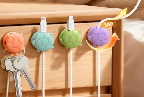 Stick these tiny turtle shells onto the side of a nightstand, TV console, or desk to create instant order among messy cords. Each clip features a fully rotatable design that allows cables to be pulled from any direction without tangling or repositioning. A spring-locking mechanism provides a secure grip, while a 7.5-millimeter slot accommodates a variety of cables, including USB, Type-C, HDMI, Ethernet, and power cords. Each set includes eight clips in assorted colors.