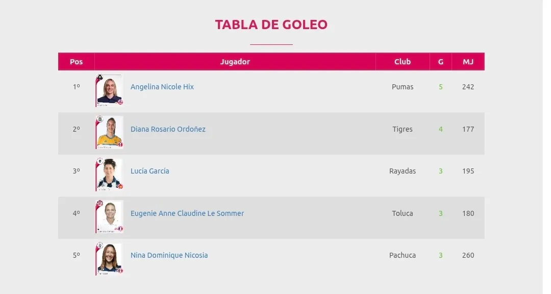Atrás de ella se encuentra la de Tigres, Diana Ordoñez con cuatro tantos. Mientras tanto, Lucía García, Anne Claudine Le Sommer y Dominique Nicosia, de Monterrey, Toluca y Pachuca, respectivamente, comparten la tercera posición.