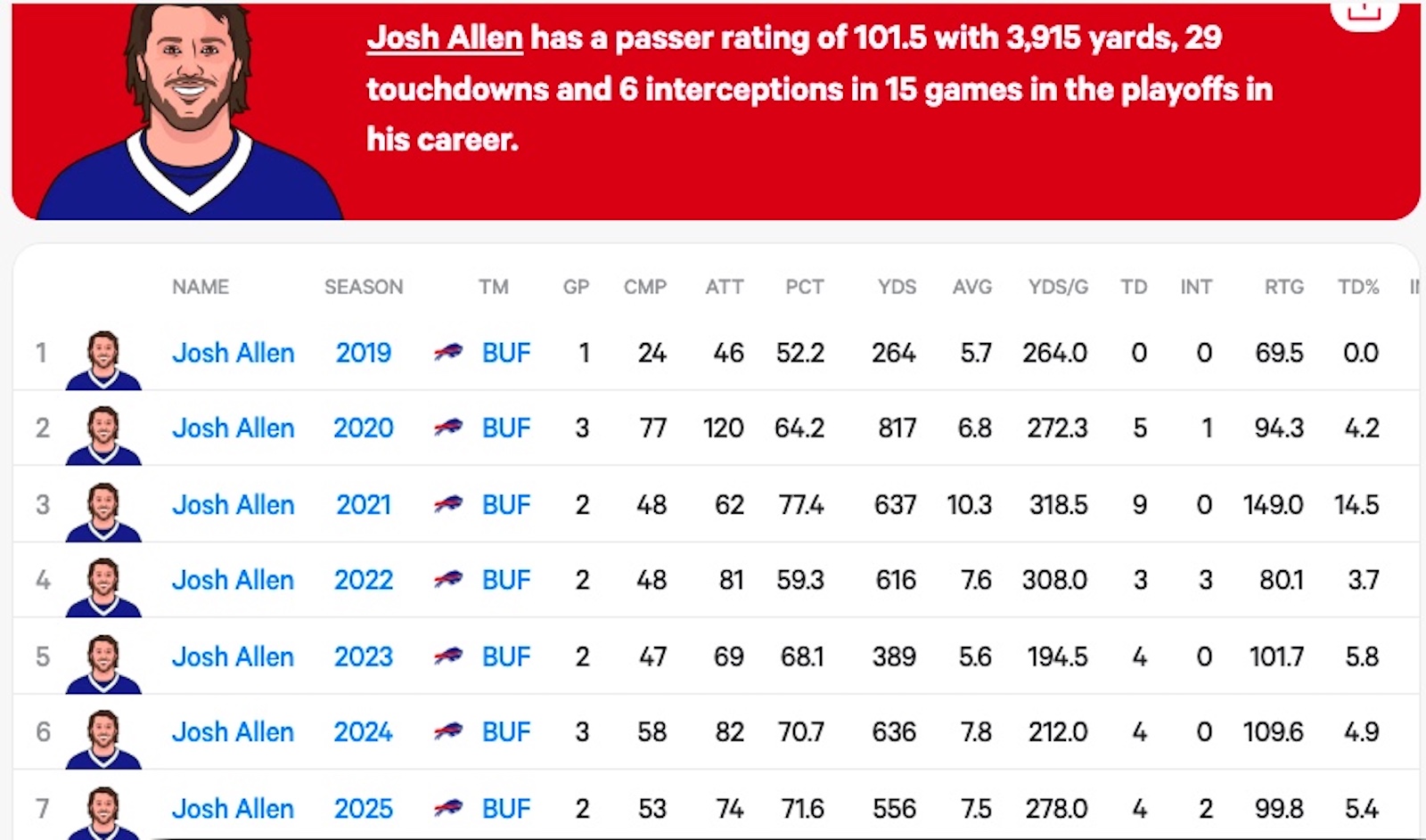 In their AFC Championship Game loss to the Kansas City Chiefs in 2025, the Bills put up 29 points, with Allen completing 22 of 34 passes for two touchdowns and zero turnovers, in addition to 11 carries for 39 yards.