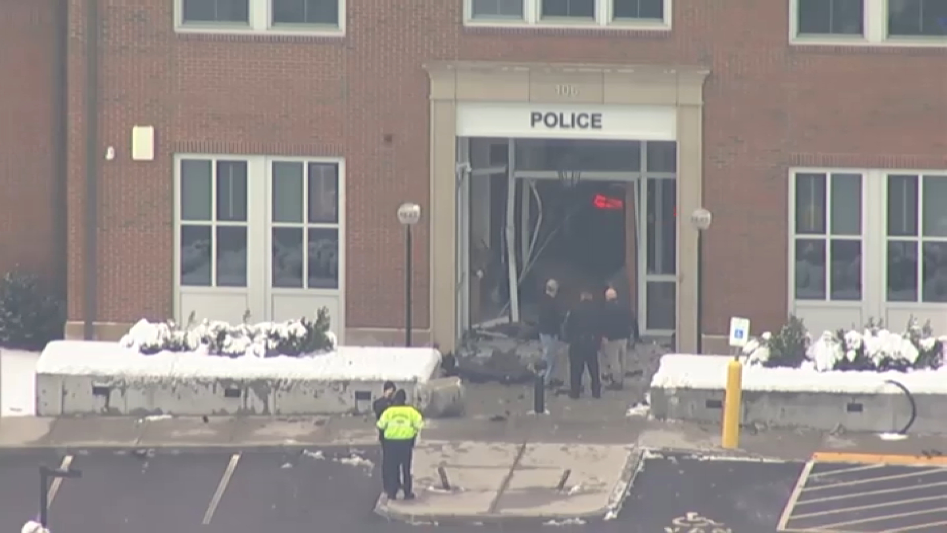Footage from the scene more than two hours later showed the vehicle, with its hazards on, still in the lobby. Officers were standing outside the damaged front door, and drones were also overhead.