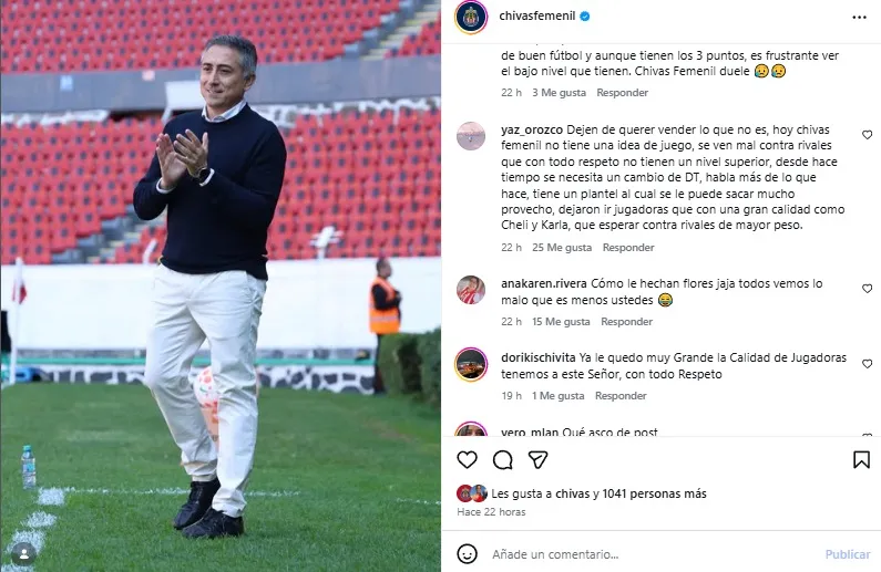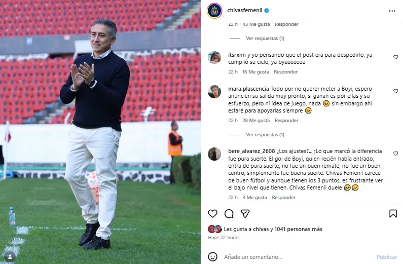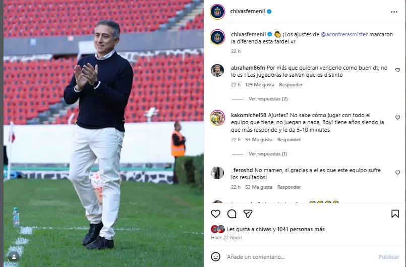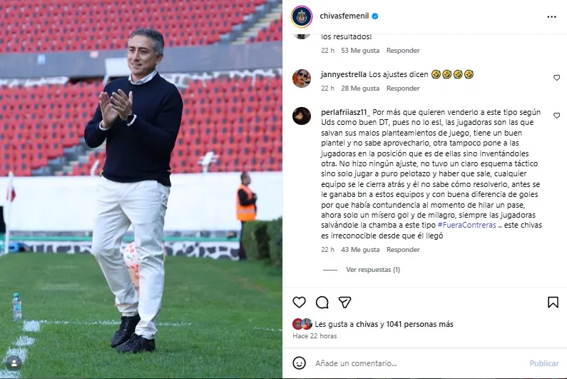 “¡Por más que quieran venderlo como buen DT, no lo es! Las jugadoras lo salvan que es distinto”, comentó un aficionado en Instagram cuando el Guadalajara destacó los movimientos de Antonio Contreras. Y otro agregó: “Ajustes? No sabe cómo jugar con todo el equipo que tiene, no juegan a nada, Boyi tiene años siendo la que más responde y le da 5-10 minutos”.