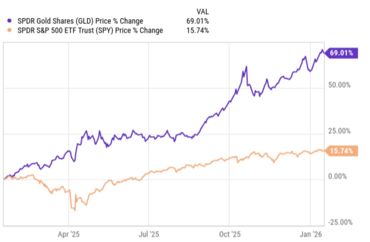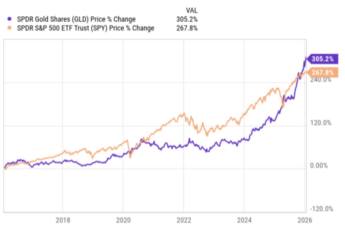And in the last year, the contrast is even more stark and the trade has accelerated, with gold beating the S&P by about 54%.