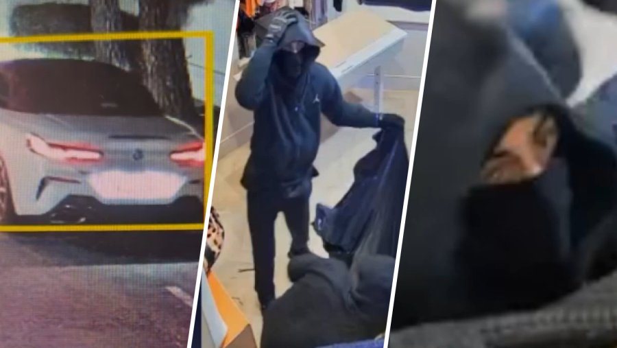 El video de vigilancia mostró la rápida acción de los tres ladrones y sus vehículos de escape: un BMW y un Mercedes nuevos con placas temporales de un concesionario de autos.