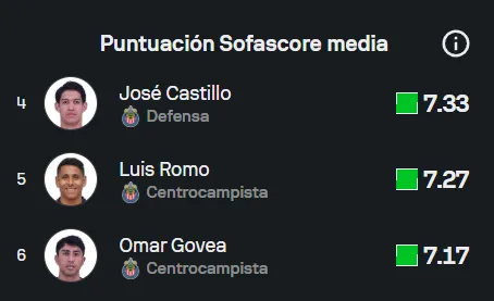 Para dimensionar su impacto desde una mirada más objetiva, basta revisar las calificaciones de Sofascore en lo que va del torneo. José Castillo obtuvo 7.3 ante Pachuca, 7.6 frente a Juárez y 7.1 contra Querétaro, números que lo colocan como el cuarto mejor jugador de Chivas en el Clausura 2026, a pesar de no ser uno de los nombres más mediáticos del plantel.