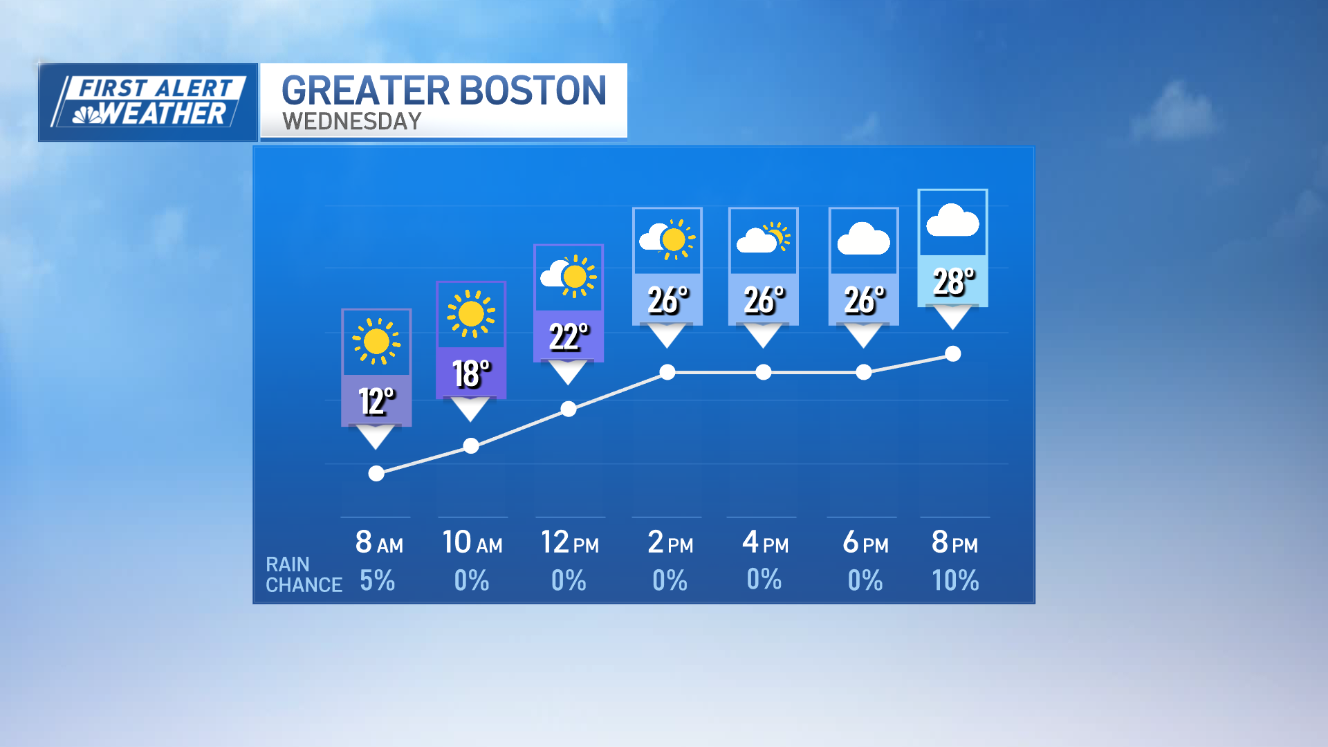 Our first order of business is trying to warm things up. Temps will recover after a frigid start, but our daytime limit will keep us in the 20s. Late into the evening, our temps will get a second wind – spiking into the mid-30s well after dark.