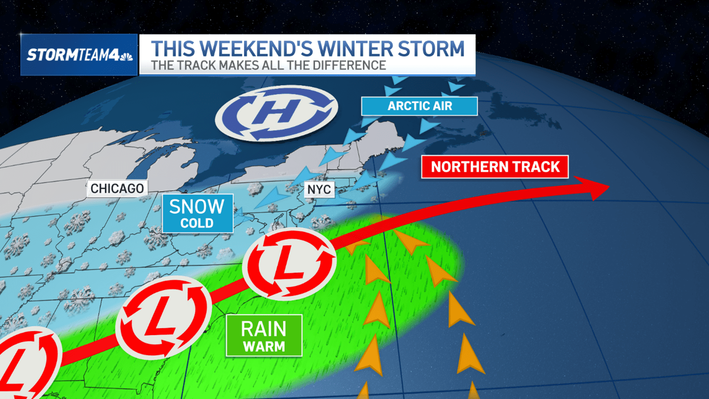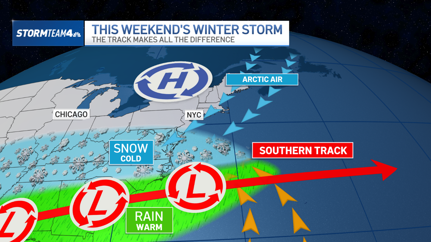 - A northern track means the low-pressure system will be closer to the tri-state and snow is more likely. A more southern track would send the bulk of the snow well to our south.