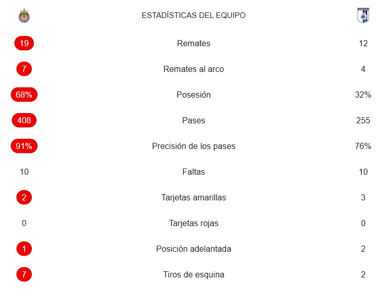 El dominio rojiblanco no solo se percibió en la cancha, sino que quedó respaldado por las estadísticas. Guadalajara tuvo el 68% de posesión del balón, completó 408 pases por apenas 255 del Querétaro, remató 7 veces al arco contra 4 del rival y generó 7 tiros de esquina a favor, por solo 2 de los Gallos, confirmando que atacó de forma constante durante todo el partido.