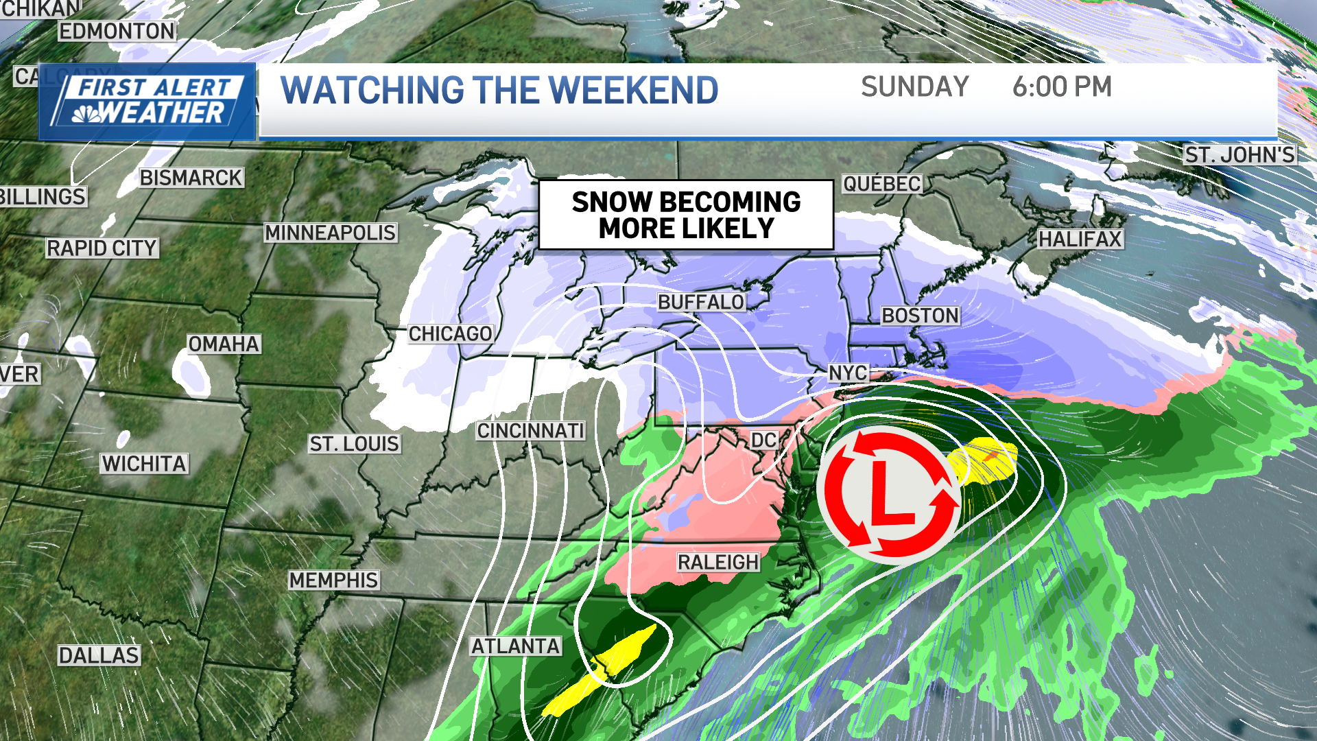 The snow chances for New England to New York have increased significantly in the last 24 hours. Our probability of 6 inches of snow or more for Boston has increased to now a 40% to 60% chance Sunday into Monday.