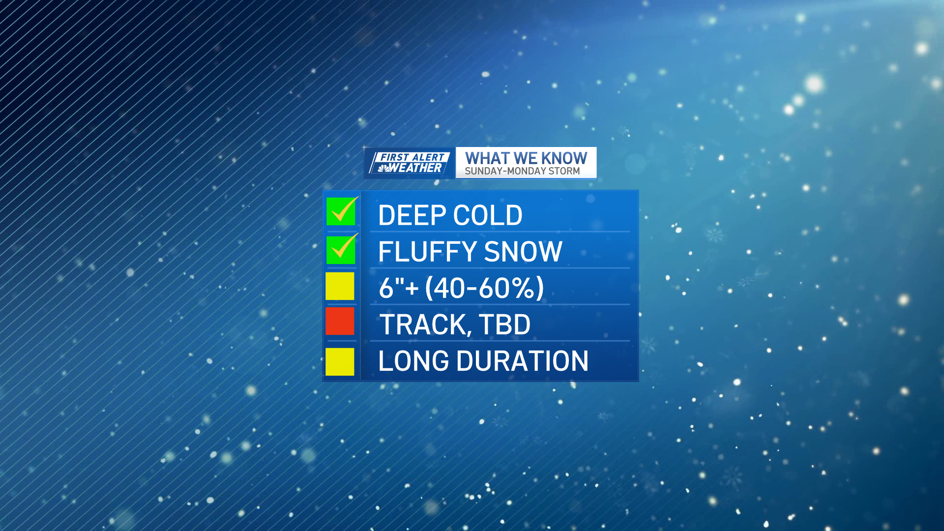 We still have to lock down the track and specific timing. We’re confident that lots of cold arctic air will be in place across the northeast for Saturday through Monday. This means the snow we get will be quite fluffy, adding up to quicker snowfall totals. Stay tuned for updates through the week.