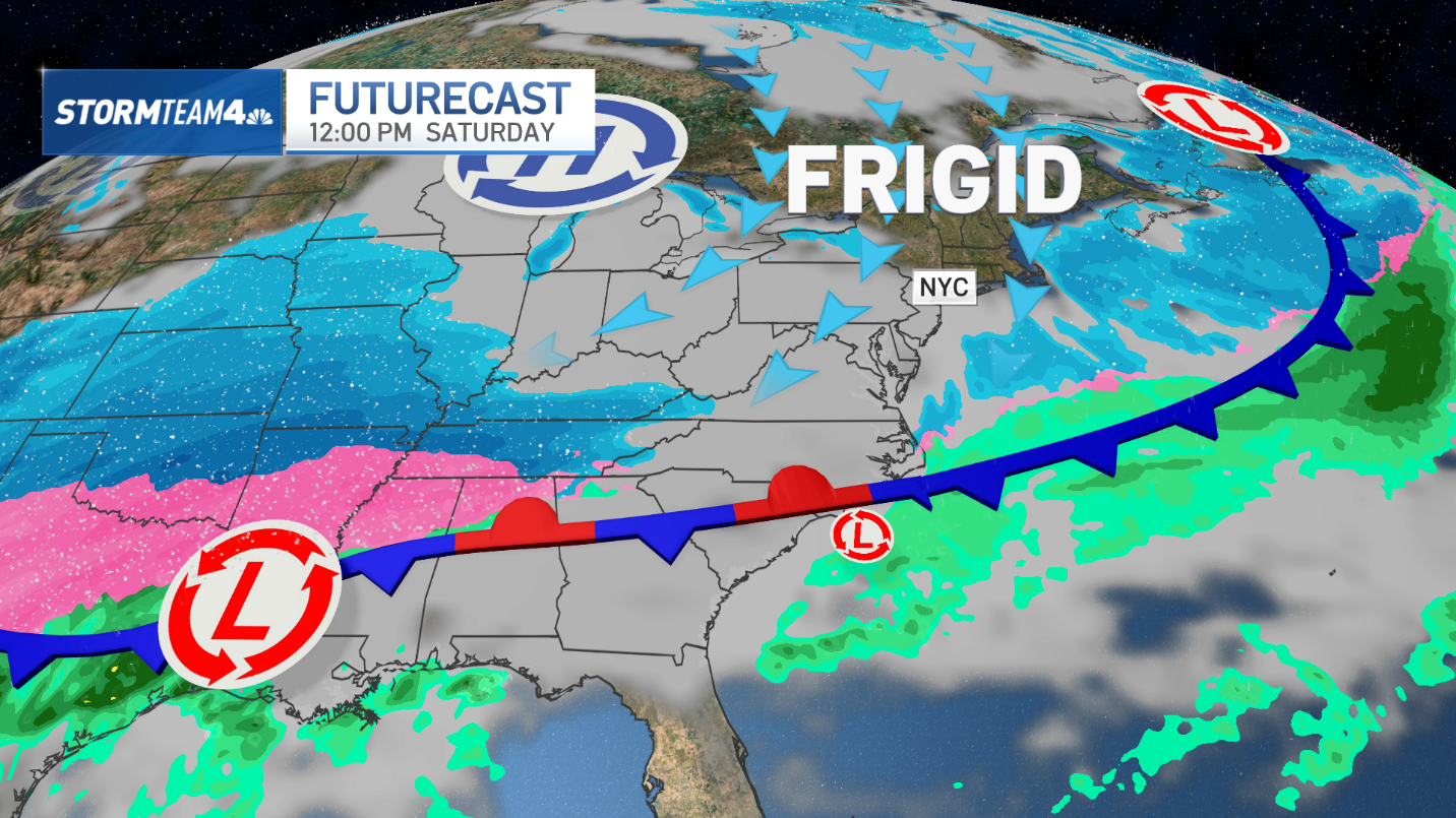 The storm will develop over Texas on Saturday, but the East Coast won’t feel a direct impact until Sunday. That’s when snow, sleet, freezing rain, and rain will impact everyone from New England to the Southeast.