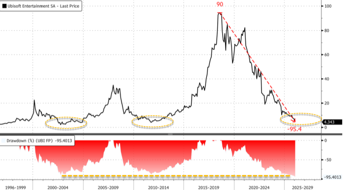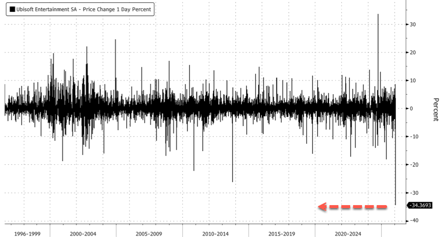 Ubisoft Entertainment SA shares in Paris crashed the most on record after the maker of Tom Clancy's Rainbow Six Siege (more commonly known for Assassin's Creed) announced widespread restructuring, studio closures, project cancellations, and sharply lower guidance.