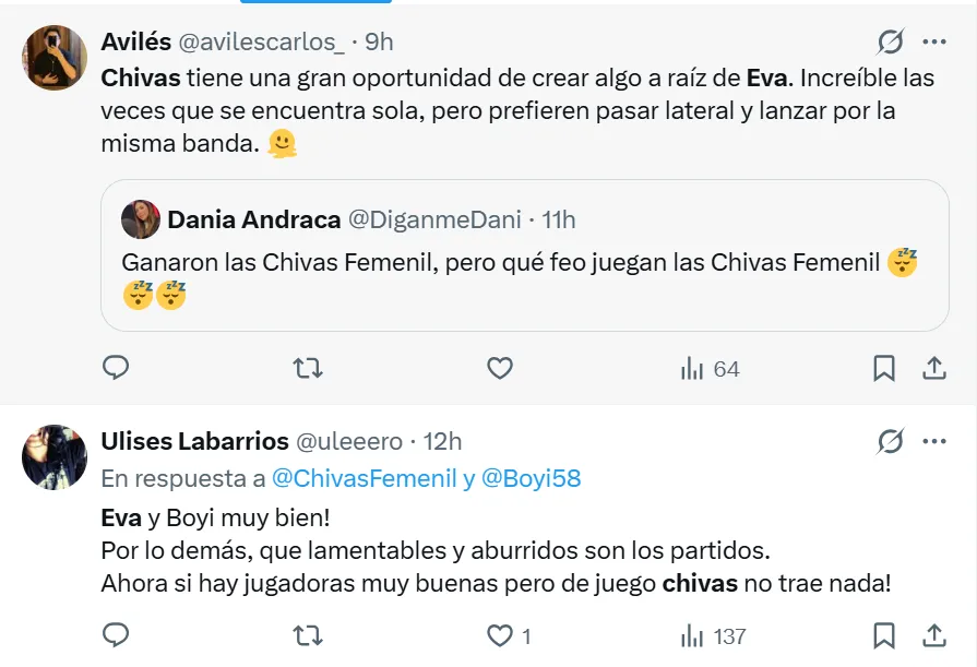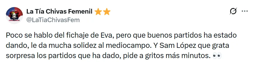 En ese contexto, Eva González ha sido destacada por usuarios de redes sociales como una pieza que ha superado las expectativas iniciales. Comentarios como “Poco se habló del fichaje de Eva, pero qué buenos partidos ha estado dando, le da mucha solidez al mediocampo” reflejan la percepción positiva de parte de la afición, que ha valorado su inteligencia para ocupar espacios y asistir en la construcción del juego.