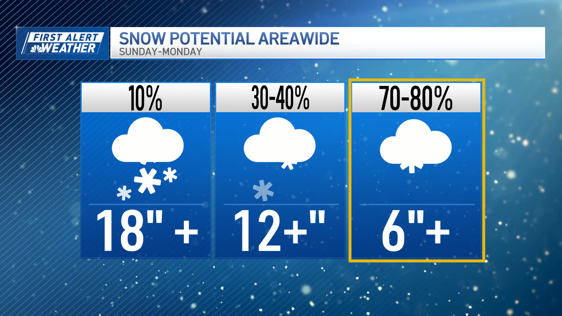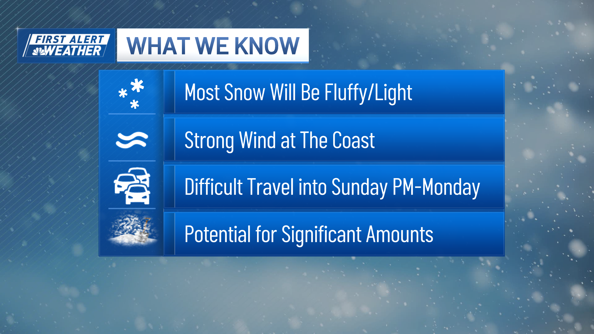 We know there’s a great deal of travel impact locally (roads) and regionally (airports). If you have flights you can reschedule, now might be a good time to do that. Local roads may become difficult to navigate later Sunday as snowfall rates (how quickly the snow piles up) and winds increase – especially along the coast. This does not look like a blizzard, but it may be hard to get around during the height of the storm. Which, along with specific snowfall amounts, is one of the things we’re working on in the coming days.