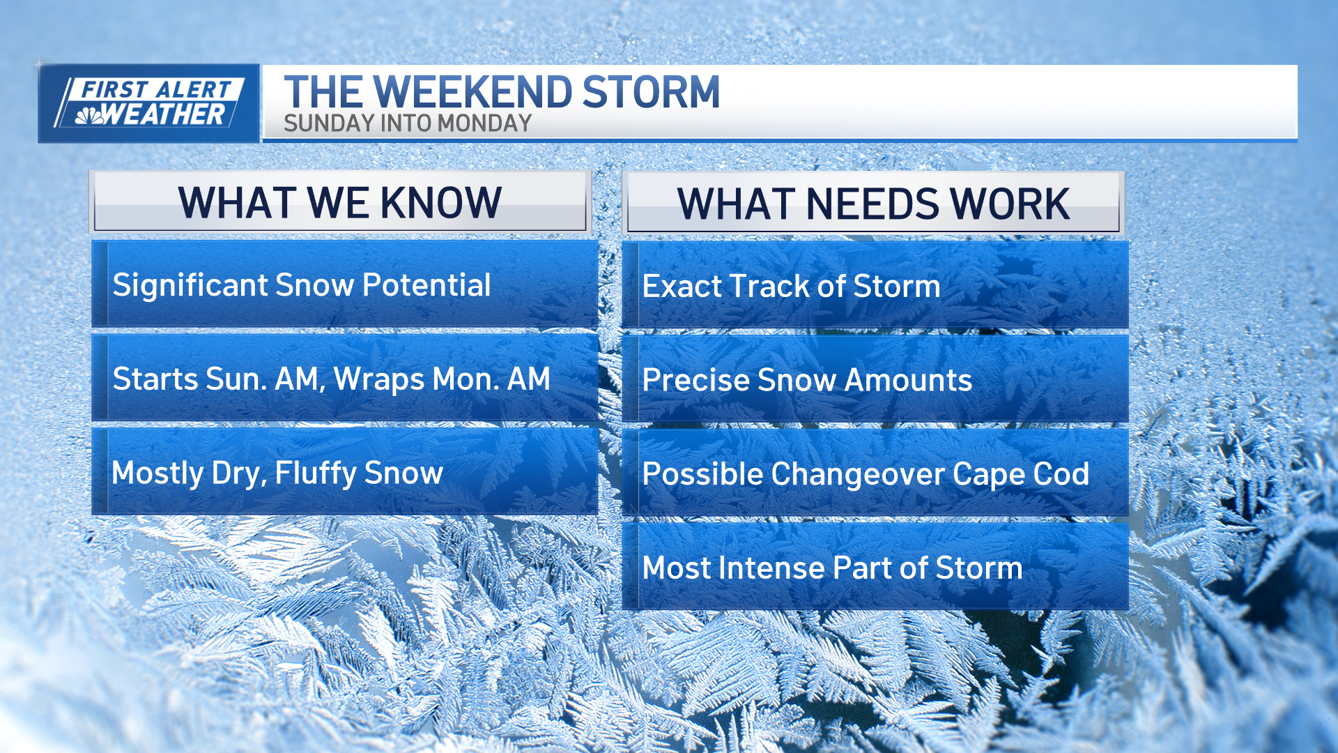 We are fairly certain of the timing (early Sunday) and the finish (early Monday), but peak storm intensity could waver by a few hours.