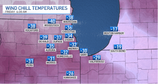 In parts southeast of I-55, and in northwest Indiana, wind chills would range from -20 to -30.