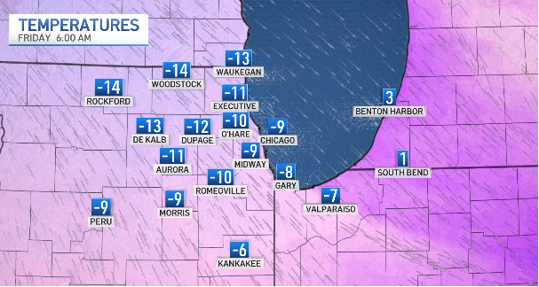 At that time, air temperatures in Chicago are expected to be about -10 degrees. In counties to the south and in northwest Indiana, they may be slightly warmer, at about -6 degrees.