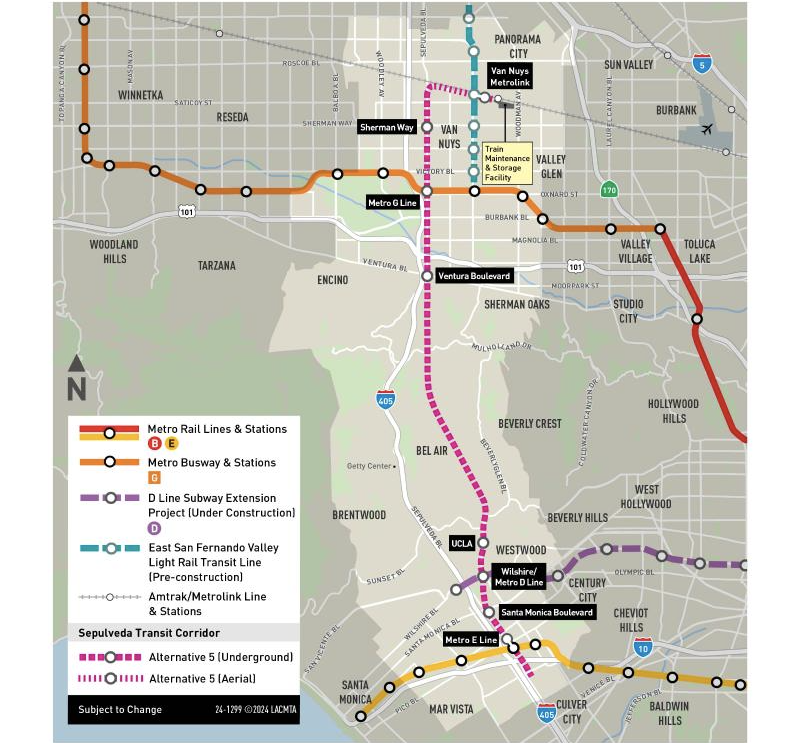 The Sepulveda Transit Corridor Project Locally Preferred Alternatives included options for the project pursued to provide an alternative to navigate on of Los Angeles busiest commutes on the 405 Freeway. The board’s Planning and Programming Committee recommended approval of Modified Alternative 5, a heavy rail transit option that would run underground between the Van Nuys Metrolink Station and the E Line Expo/Sepulveda Station.