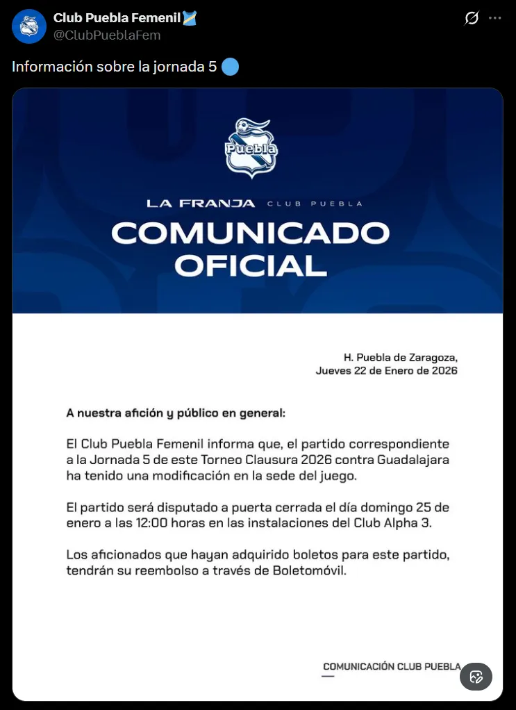 Sin embargo, no todo han sido buenas noticias para el Guadalajara. Este jueves, el Club Puebla Femenil anunció oficialmente que su partido ante Chivas cambiará de sede, ya que no se jugará en el Estadio Cuauhtémoc como estaba previsto originalmente, sino en un deportivo, situación que vuelve a alterar la logística del equipo rojiblanco.