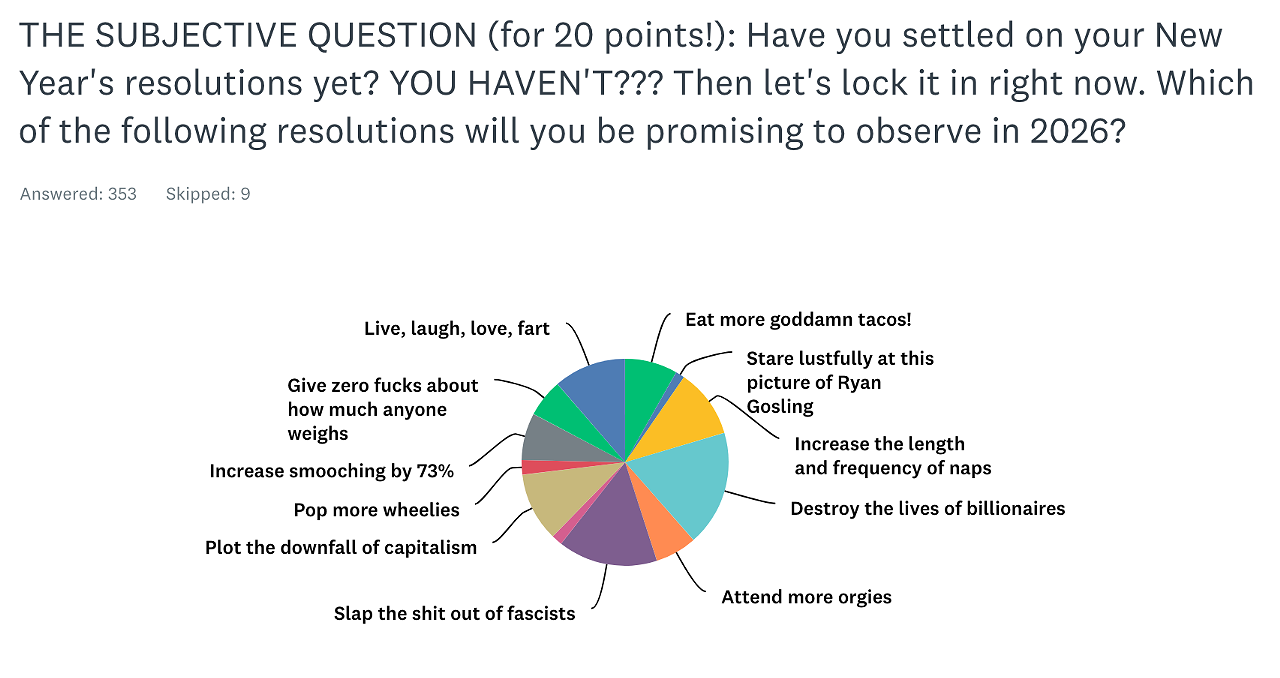 But first! How did you do on our last quiz? Simply smashing, darling! And I love that, in our New Year's resolution-themed "subjective question," you had trouble deciding whether to destroy billionaires, slap fascists, or take a nap. SAME, friends. SAME.
