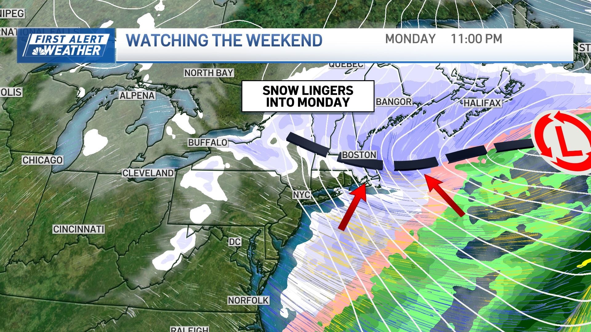 The storm’s intensity may drop late Sunday night, then return with lighter, steadier snow into Monday. Some guidance is suggesting that the snow will linger deep into Monday night, but we’re still uncertain about exactly where that may be. Perhaps it is only in Eastern Mass or perhaps it is farther north. That may be a game time decision – but also a critical one for additional snow accumulation.