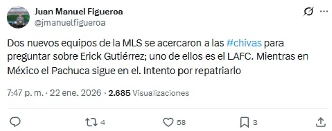 Mientras se habla que Guti va a entrenar con la Sub-21 sale a la luz que en la MLS habría salido un nuevo interesado por él. “Dos nuevos equipos de la MLS se acercaron a las Chivas para preguntar sobre Erick Gutiérrez; uno de ellos es el LAFC. Mientras en México el Pachuca sigue en el. Intento por repatriar”, reveló Juan Manuel Figueroa en X.