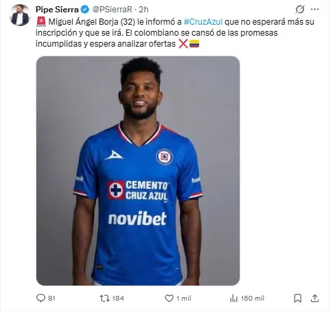 En medio de este contexto, Cruz Azul podría volver a aparecer como una opción interesante porque se acaba de caer la llegada de Miguel Ángel Borja. A pocos días de que cierre el mercado de pases y con problemas con el cupo de extranjeros, el atacante rojiblanco podría ser una buena oportunidad para el Clausura 2026.