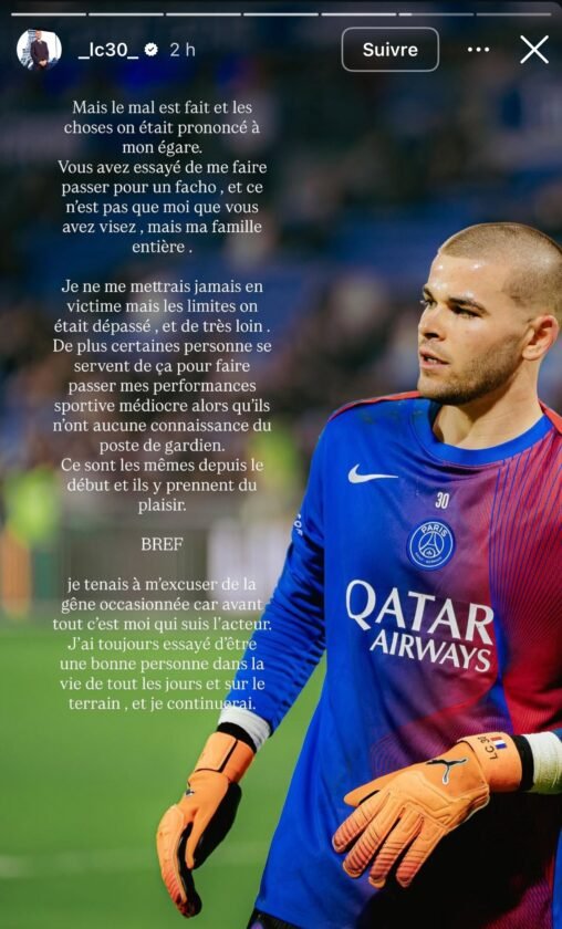 Le portier de 24 ans raconte avoir découvert les accusations en se réveillant de sa sieste d’avant-match : « J’ai pu voir ce qu’il a pu se dire à mon propos la soirée précédente, concernant le fait que j’ai liké une publication sur Instagram d’une orientation politique, que je ne partage pas bien évidemment, a écrit Lucas Chevalier dans une story Instagram aux allures de communiqué ».