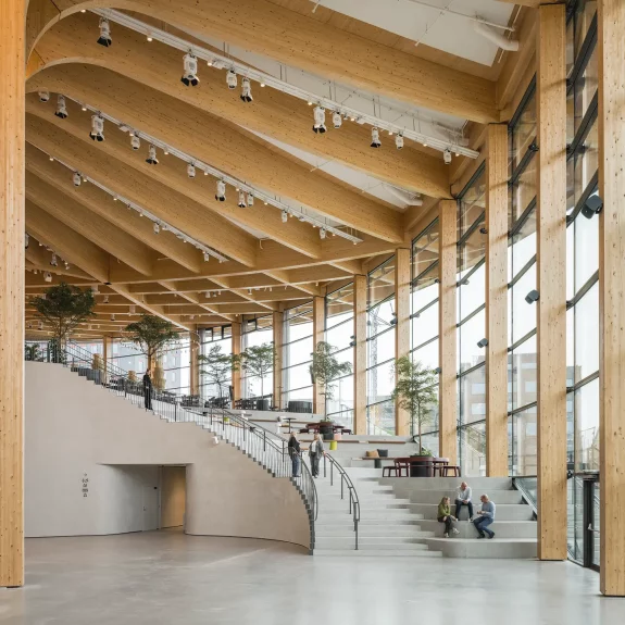 Conçu par le célèbre studio scandinave Henning Larsen Architects, le bâtiment est un hommage à l’extérieur scandinave, construit principalement en bois provenant de Suède et du sud de l’Europe.