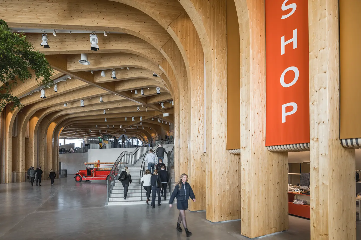 L’impressionnant bâtiment est soutenu par 2 300 grandes poutres en bois et 2 700 planches de bois lamellé-croisé, les trois plus grandes poutres s’étendant chacune sur une longueur de 34 mètres.
