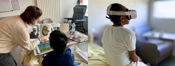 La réalité virtuelle apportera l’art au chevet d’enfants hospitalisés en soins critiques (services d’oncologie, de greffes et soins palliatifs). Une médiatrice interviendra en deux temps minimum, en alternant le visionnage de l’exposition avec le casque, à des activités de transmission de connaissance et de pratique artistique.